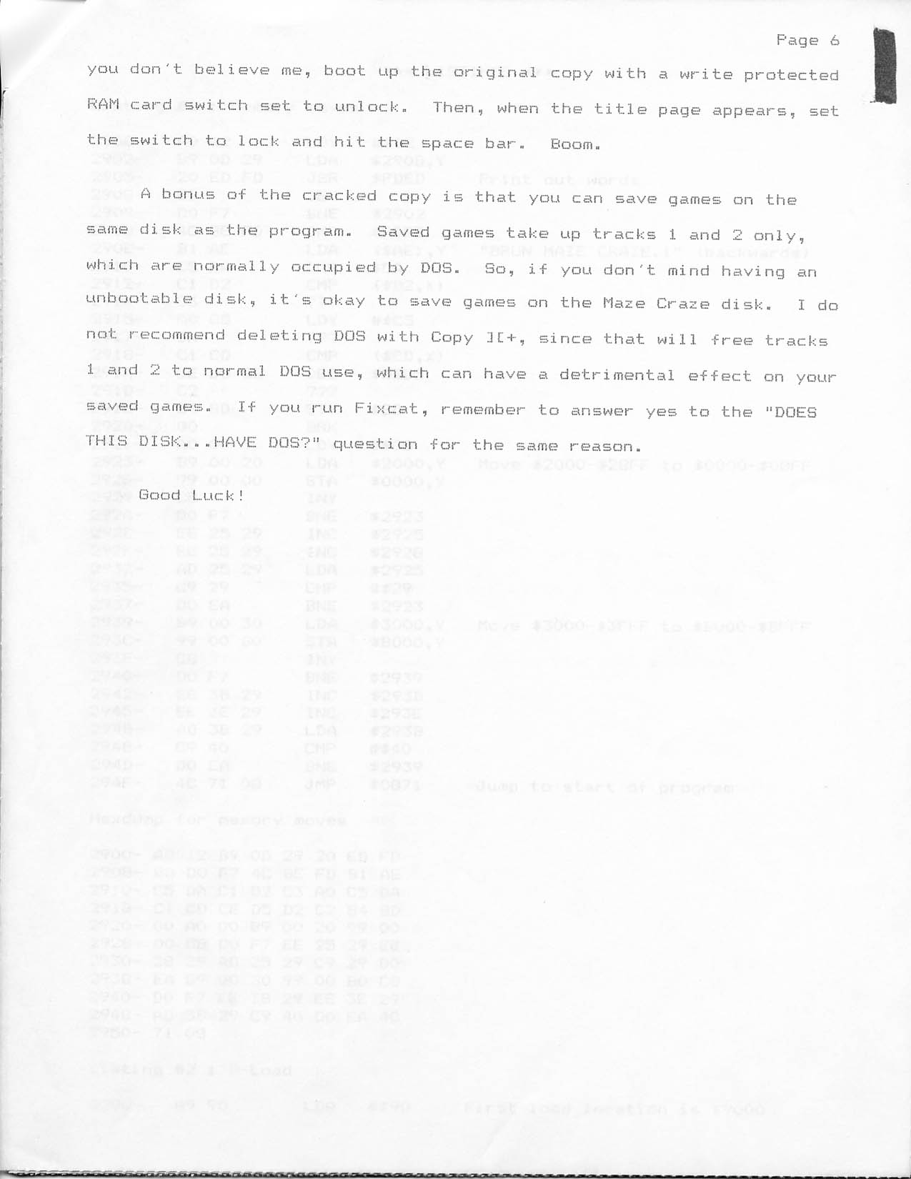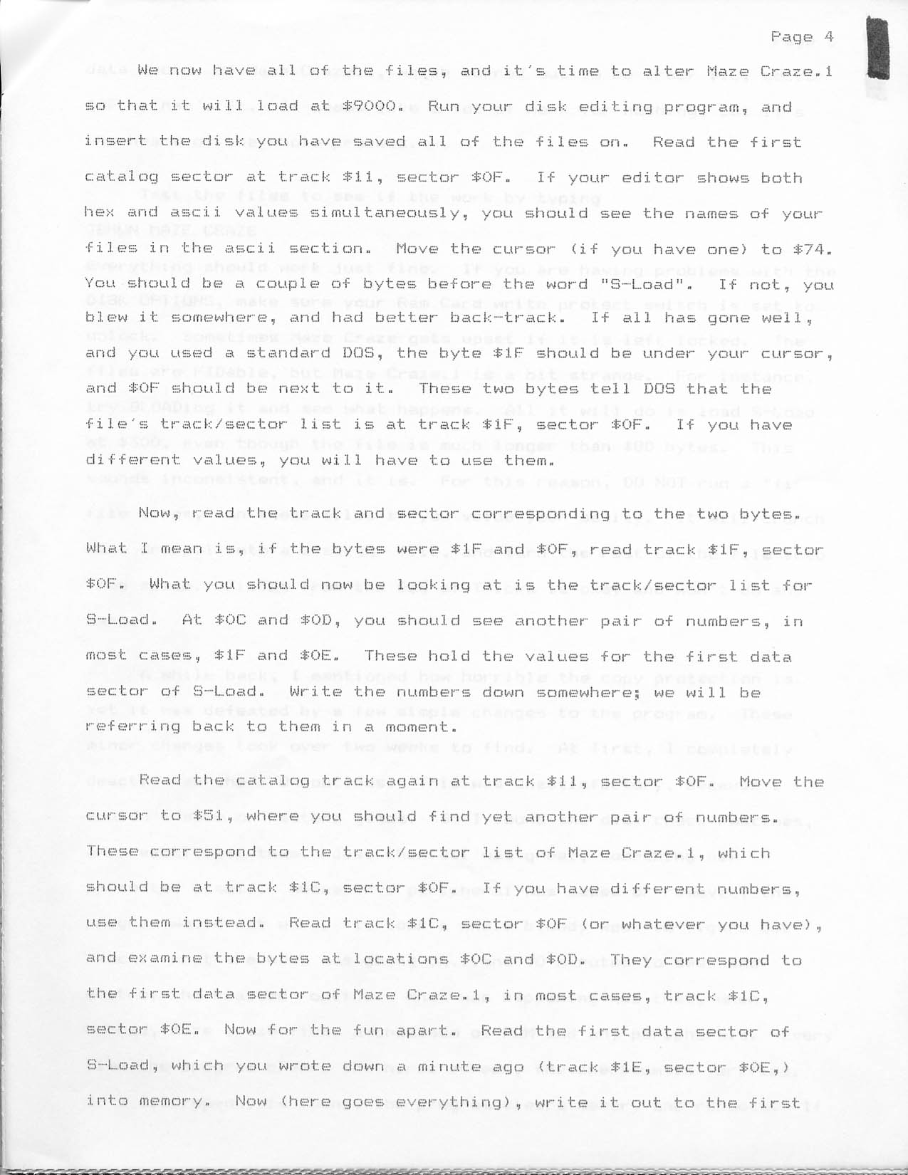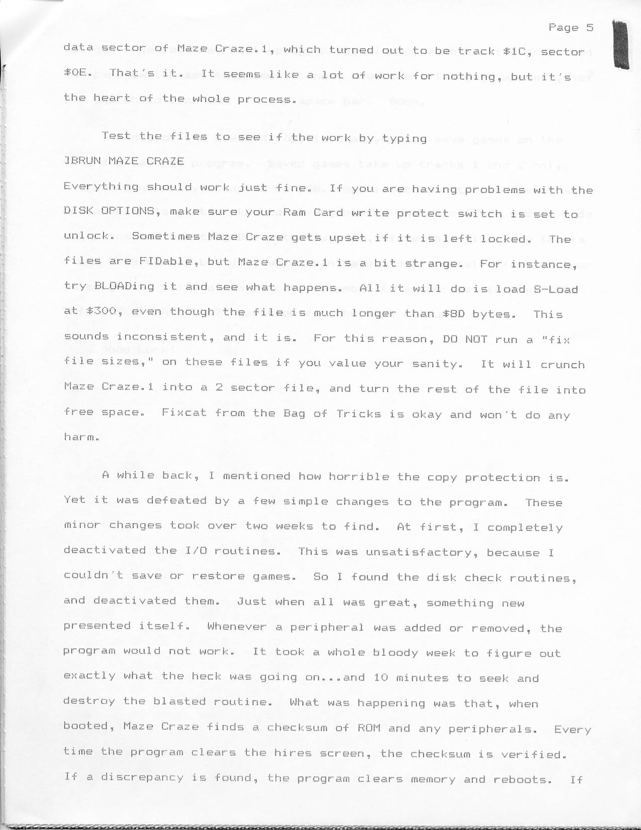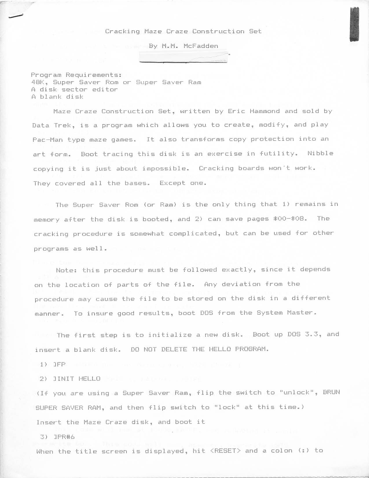 Spiradisc was used on Sierra's "Frogger" and "Maze Craze Construction Set" titles. It truly was state-of-the-art. My favorite trick was the way they defeated NMI copy cards, which captured a snapshot of the computer's memory after the game had loaded. The easiest trick -- corrupting your stack pointer when the game is idle, so the interrupt frame overwrites a valid return address -- was too obvious, and too easily circumvented. Instead, Spiradisc collected some information about the computer's configuration as it was booting. This was periodically re-checked. If the computer had mysteriously gained or lost peripherals, the game knew it was running on a different computer, and would bail. This meant that memory-image copies would appear to work until you tried using them somewhere else, which, as intended, had me running in circles for a few days (the copy card was in a friend's computer).Mark [Duchaineau]'s scheme involved arranging data in spiraling paths on the disk, so information could not be accessed concentrically, like a needle following a record, but in several spiraling paths. That was why Mark called the scheme "Spiradisk." The different arrangement would thwart programs which broke copy protection and allowed pirates to copy disks. While not being totally pirate-proof (nothing is), Mark's scheme would defy Locksmith, and any other commercial scheme. And would take a hell of a long time for even a devoted hacker to crack.