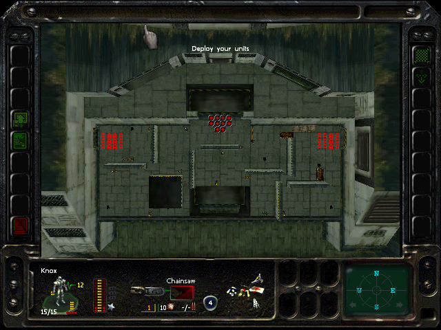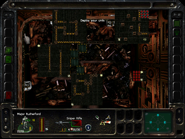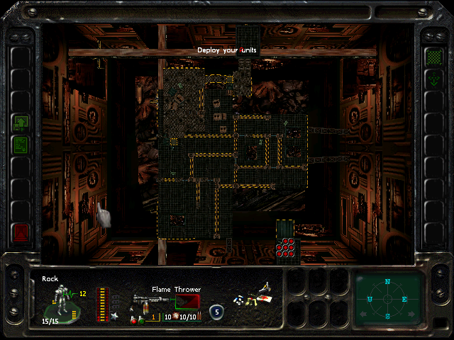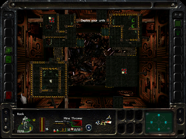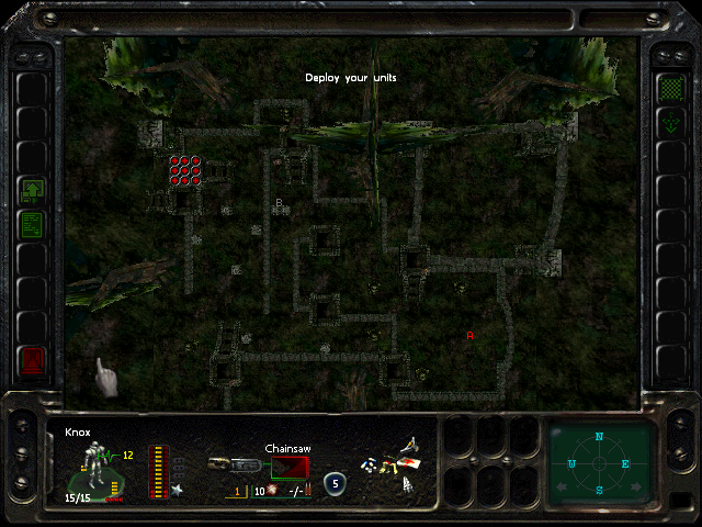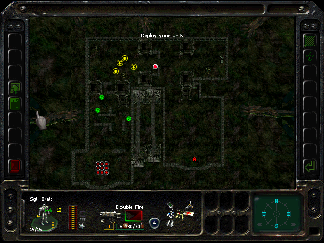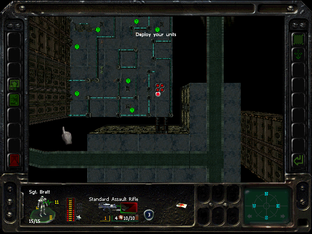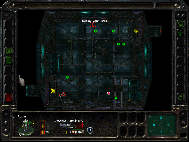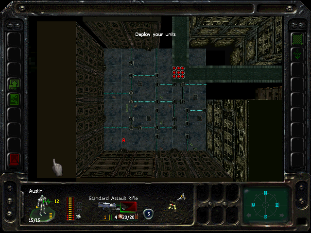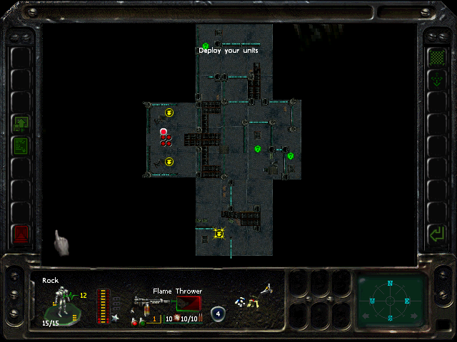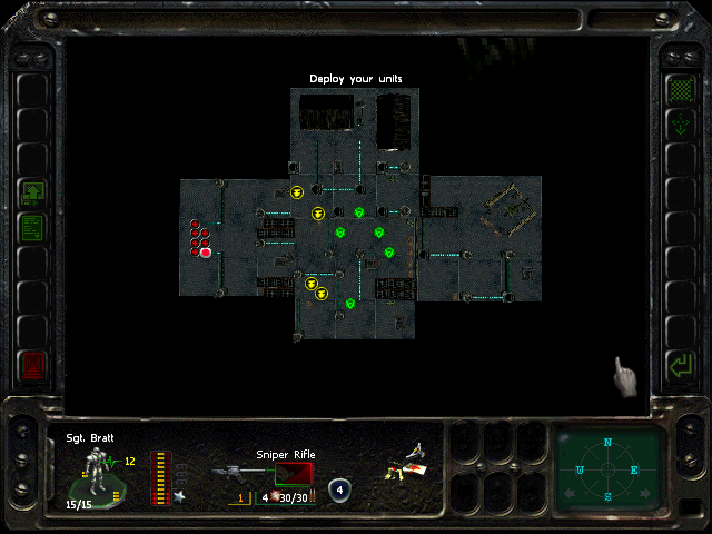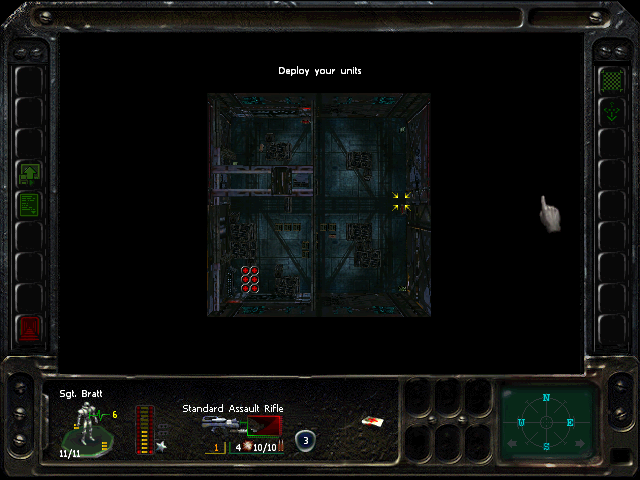 Turn 10: you want to create a 'T' shape, with Rock (who has the Light Stimulant) in front of the door to the NE area, Austin to his right, Knox to his left, and Bratt below. Rock rests, gaining an AP. Bratt and Austin shoot any Gore'Ther that come down the hall from the east, and Knox uses has bayonet to defend the west. Defensive fire shouldn't be used, as the Ray'Ther tend to jam up at the choke points, helpfully limiting the number of attackers.