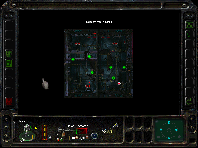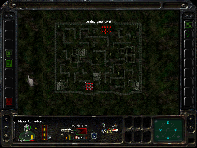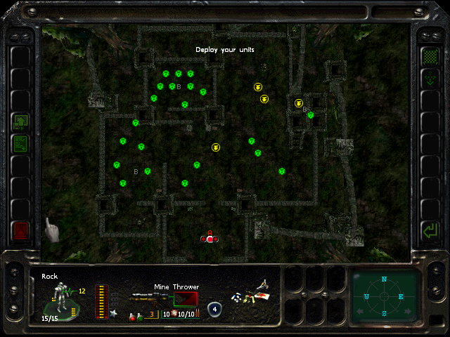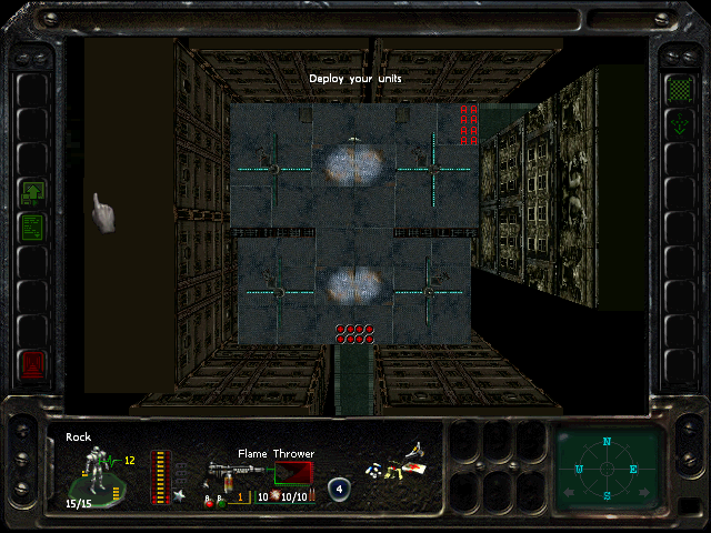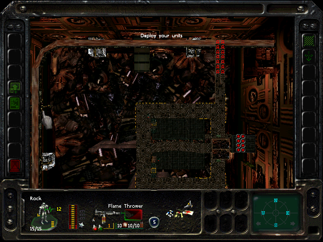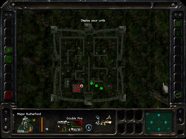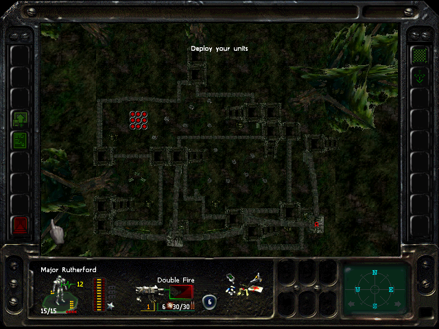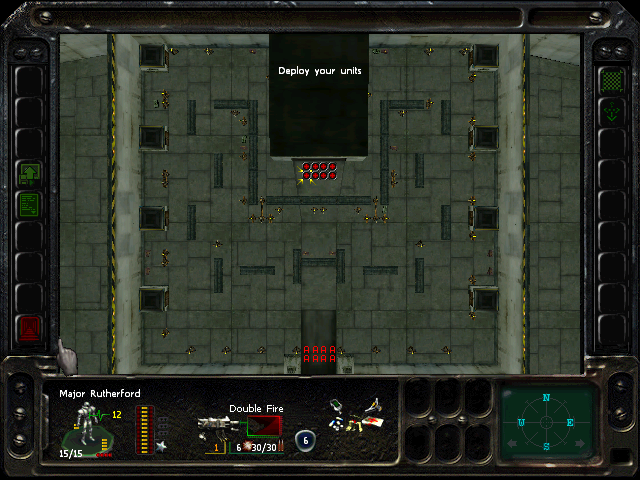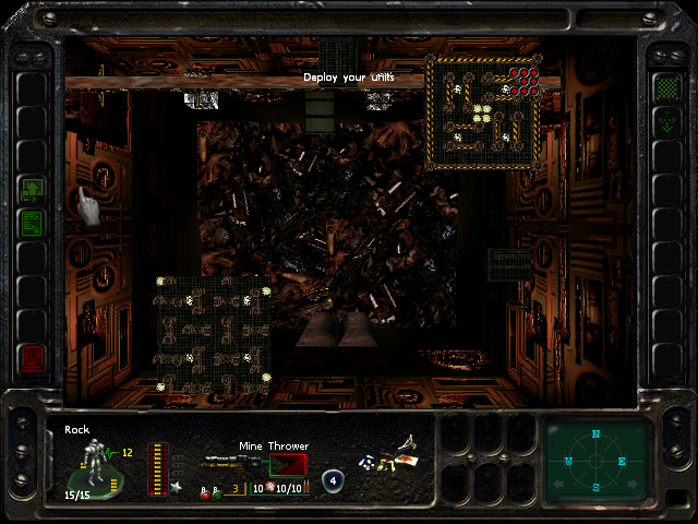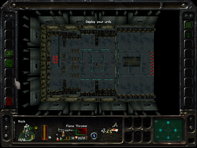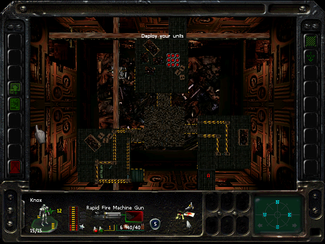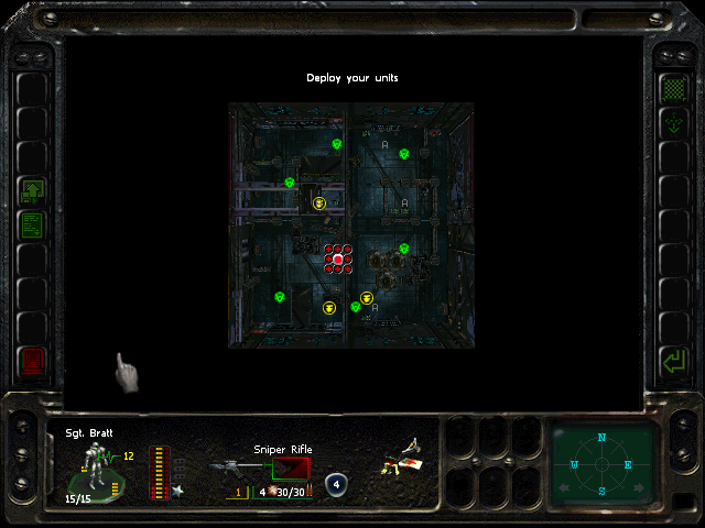 Turn 10: you want to create a 'T' shape, with Rock (who has the Light Stimulant) in front of the door to the NE area, Austin to his right, Knox to his left, and Bratt below. Rock rests, gaining an AP. Bratt and Austin shoot any Gore'Ther that come down the hall from the east, and Knox uses has bayonet to defend the west. Defensive fire shouldn't be used, as the Ray'Ther tend to jam up at the choke points, helpfully limiting the number of attackers.