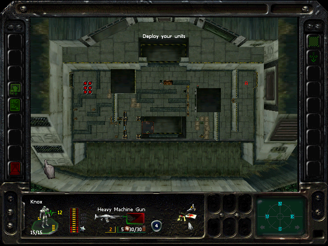 The level has pipes on the north and east walls, and is nearly symmetric. The east pipe is a bit more open when pushing the boxes from the south, allowing two soldiers to push while a third covers, but the middle box must be pushed twice before it's in place. You seem to get hit harder sooner if you go north, so we're going to go east.