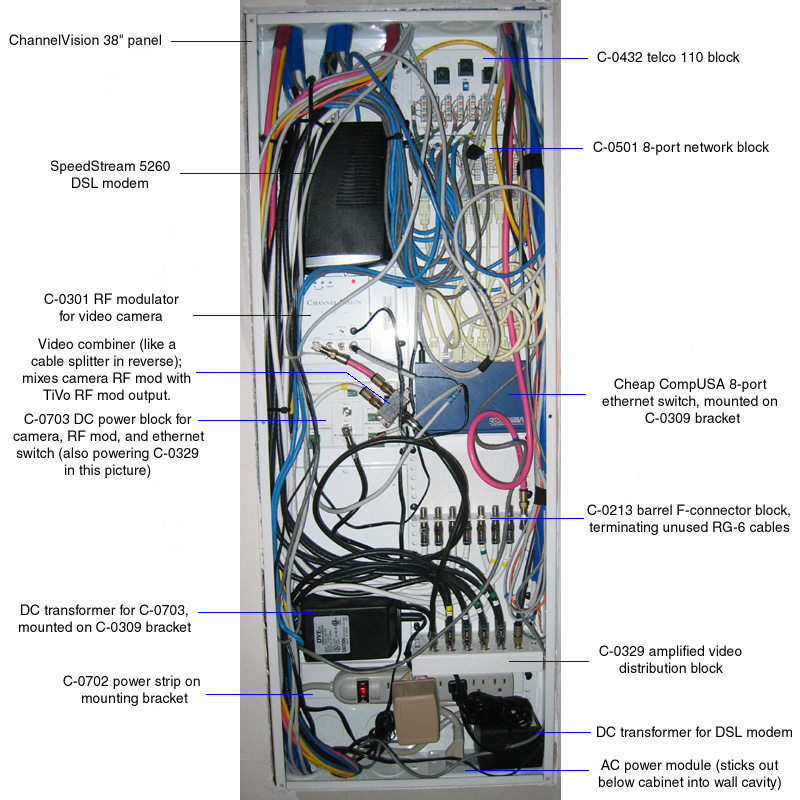 Comparing the above to the setup in my townhouse is tricky, because I kept some of the old stuff (IR receivers/emitters), and added some new things (the camera and its RF modulator). The ChannelVision blocks with mounting brackets tend to be more expensive than their "loose" counterparts. I already had all of the tools, and vaguely remembered how to use them.